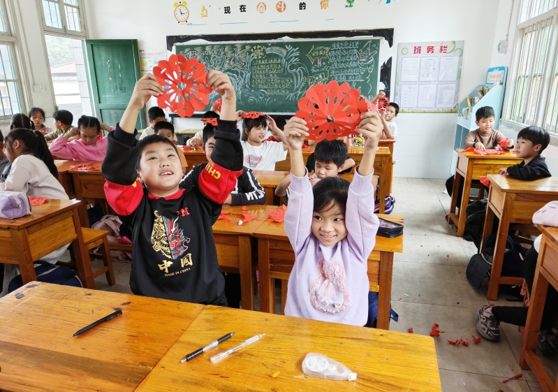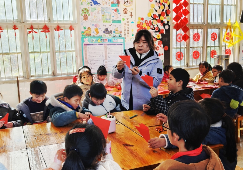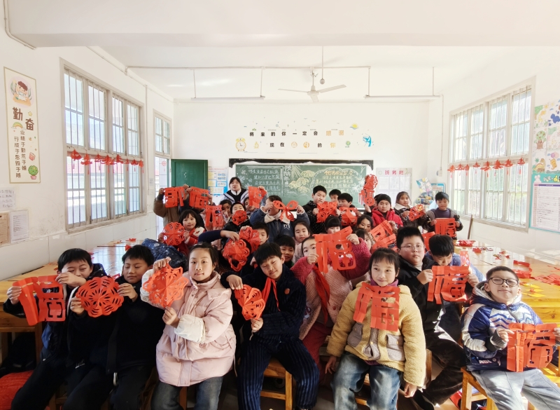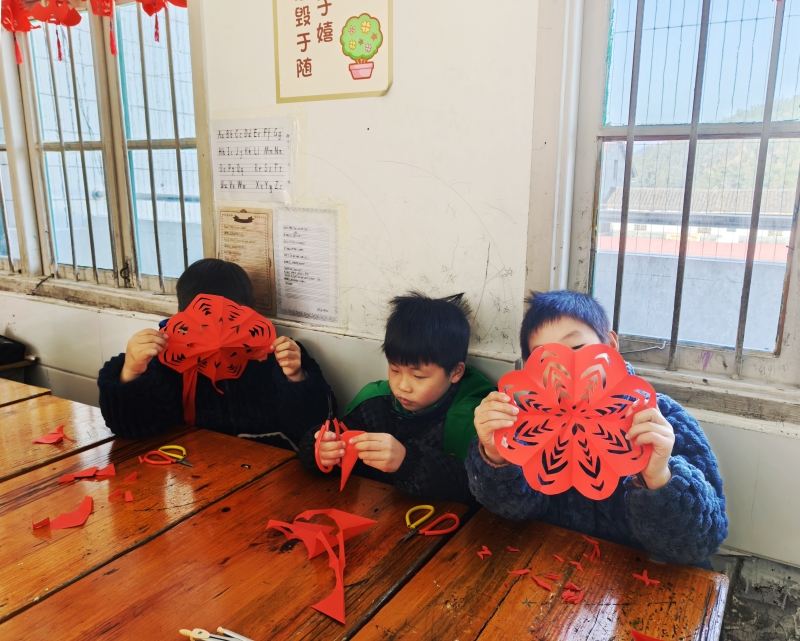 中远海运慈善基金会“为中国而教”项目支教教师黄丽岛在湖南安化县田庄乡龙门小学支教已进入第三个年头。新春来临之际,她和同学们一起按照窗花样子,时而轻剪,时而细刻,剪刀一开一合之间,各种红彤彤的“春”字、“福”字、窗花等民间剪纸图案喜气洋洋地展现在孩子们的手中……